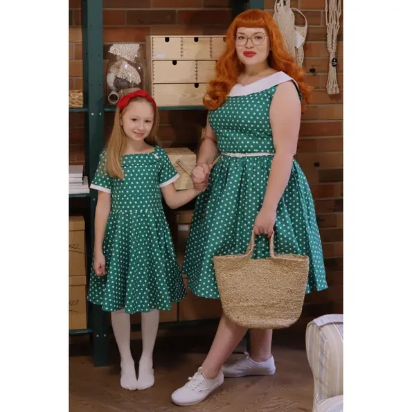 We had so many requests from our lovely customers to make their favourite dress in a mini version. This cute 50s style children dress features short sleeves, a wide fitted waistband, a vintage full circle skirt and an slightly, off the shoulder neckline with button detail. This stylish dress is made from super soft cotton, fastens with a concealed side zip. Children just love it! Print: Green & White Polka Dots Material: 95% Cotton, 5% Elastane Washing instructions: Wash between 30-40 degrees. Spin-on low spin cycle and do not tumble dry.